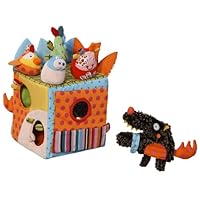 I am disappointed with this product. My daughter loved it because the rooster, cow and pig all make sounds and the wolf is a finger puppet. It was easy for her to squeeze the animals and create the pounds at 1 year of age and she enjoyed putting them in the holes and getting them out again. However the animals sounds started o whither shortly after we bought it as if the batteries were dying but there is no way to change out batteries so now we just have these little animals with either weak or no working sounds. For the price I would have expected years of use instead of just months.