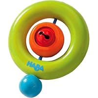 This toy is the same size around as the bottom of a standard plastic 16.9 oz bottle of water. Much smaller in size than I had anticipated. Bell doesn't work. Makes no audible chiming sound. I do not recommend this product.Most of the toys I've bought my daughter are Haba. This toy is a huge disappointment. It is much smaller than I expected and the bell does not ring or chime. It is so tiny that the way it is constructed the only sound it makes is a very muffled ding.Buy Haba Dotti Clutching Toy Now