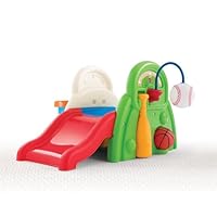 I bought this for my 12mo old and he won't touch it. The slide is short so his legs hit the floor while his bum is still at the top, so there isn't much "sliding". He loves any kinda of ball and the basketball is perfect size for his little hands, so he throws it around all the time.The attached baseball is sorta heavy and the blue handle/stem is starting to bend and stretch. That is just from it hanging because he doesn't play with that since it won't bounce or roll. I imagine it will break soon.
