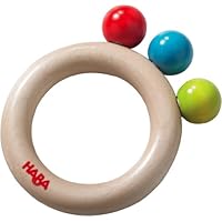My little lady is teething up a storm (age 8 mos). She loved this clutching toy so much she lost it. So I bought her a second one. The bright colors and toxic free wood make both of us quite happy!The child I gave this to, loves it! She is 4 months old and enjoys playing with this toy. I like that it safe as it is painted with natural, water-based, non-toxic lacquers that render the surface especially resistant to humidity and mechanical strain. Haba is a great toy company and all the toys I have brought from them have lasted years of baby wear and tear. A great product overall!We absolutely love anything made by Haba. They make quality baby toys and always use non-toxic paint. We bought this for our friends 6 month old baby boy. Having first hand experience with plastic teething rings (which often don't stay in the mouth long enough to be effective), we opted for this one because of the colored balls that will get and keep a baby's attention. He loves chewing on this and his little hands are able to get perfectly around the ring. Only con is that it does kinda look like he's got baby bear-knuckles =)