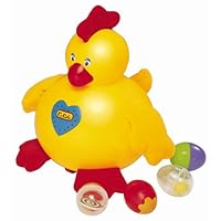 We bought this toy for our 4 month old daughter for Christmas. She is fascinated by it and would crawl after it if she were able. Instead she reaches and rolls towards Emma when Emma rolls away. I agree with the review which said that Emma doesn't work on carpet. However, Emma works great on tile and hardwood floors. The music is not annoying and I enjoy watching Emma as much as my daughter does. Great purchase overall.Bought this toy for my 2 yr old niece. Initially she enjoyed the toy, she thought it was funny when the eggs came out. However, the eggs stopped shooting out of the toy shortly after. She was over it in a week.Wednesday, October 9, 2013