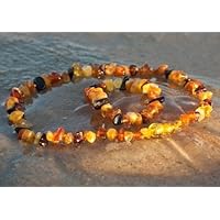 This necklace and bracelet set are very nice. The necklace is knotted after every bead and feels very durable. The bracelet looks as pictured, I do have an issue on how it's made though! The bracelet was made with elastic, the beads are not knotted between each bead! The bracelet could easily be broken by a baby due to being made made with elastic. I really wish I had known this, I would have only ordered the necklace and saved myself a little money because I'm sure I will not use it. Shipping took about 4 weeks which is understandable due to the fact it was shipped from Lithuania. If you want fast shipping look elsewhere! My Little guy isn't teething yet so I'm not sure how effective it is yet. I do have him wearing it though. Overal it's a pretty little set!